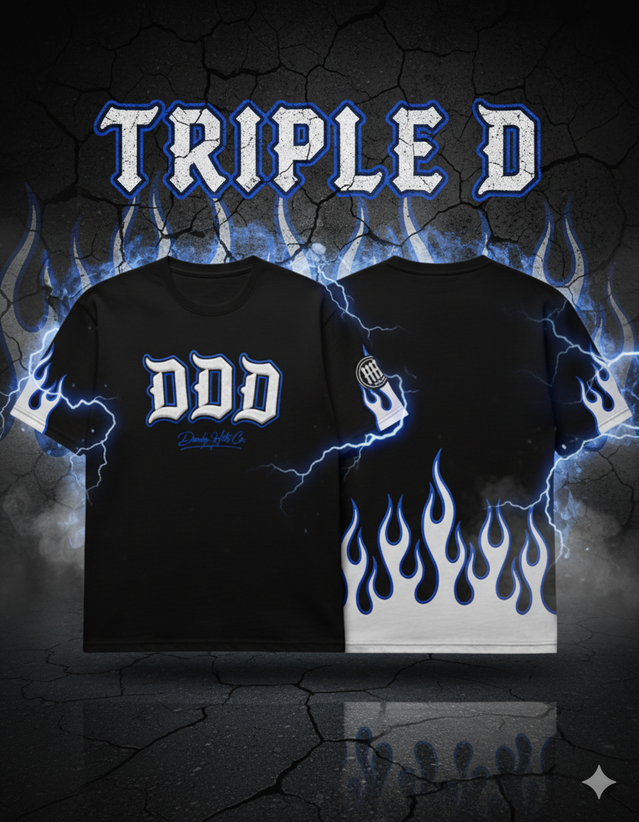 ⚡ Combina con su playera personalizada “Triple D”, creada por nuestro equipo con el mismo patrón eléctrico y flamas en degradado — un conjunto diseñado para destacar en cualquier escena.