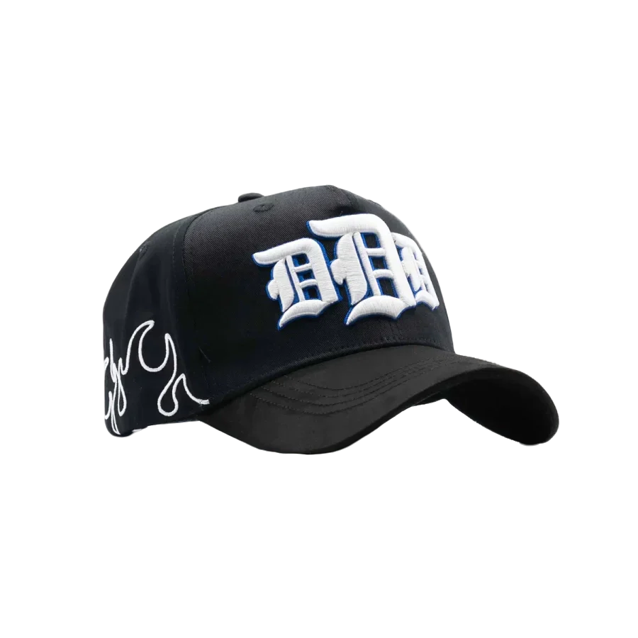 Su bordado 3D en blanco con perfil azul resalta sobre la base negra, acompañado por detalles de flamas laterales que simbolizan poder y movimiento. Es más que una gorra: es una declaración de presencia.